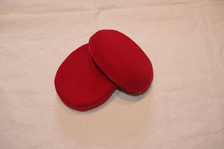 5)Con una vecchia maglia rossa ho fatto l’esterno . Ho tagliato 2 ovali e una striscia lunga come la circonferenza della scatola e con la stessa altezza;ho cucito i due lati corti della striscia insieme ottenendo un anello che ho unito a 1 dei 2 ovali